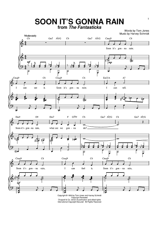 Digital Sheet Music for Soon It's Gonna Rain by Tom Jones, Harvey Schmidt scored for Piano/Vocal/Chords; id:379400