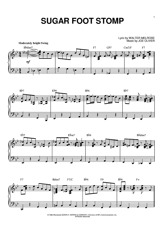 Digital Sheet Music for Sugar Foot Stomp by King Oliver, Walter Melrose scored for Piano; id:374874
