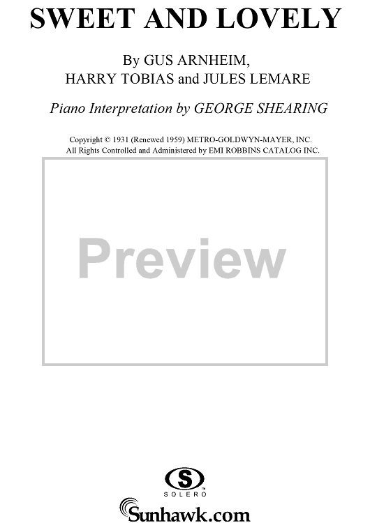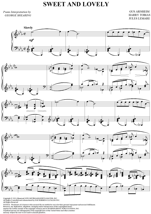 Digital Sheet Music for Sweet and Lovely by George Shearing, Gus Arnheim, Harry Tobias, Jules Lemare scored for Piano Solo; id:116407