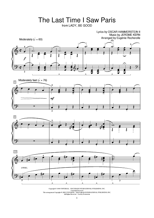 Digital Sheet Music for The Last Time I Saw Paris by Jerome Kern, Oscar Hammerstein II, Eugénie R. Rocherolle scored for Piano; id:381818
