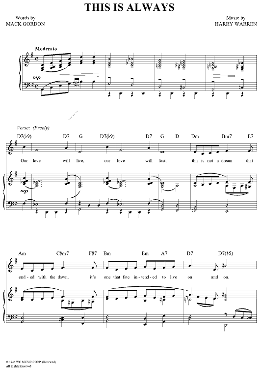 Digital Sheet Music for This is Always by Harry Warren, Mack Gordon scored for Piano/Vocal/Chords; id:264504