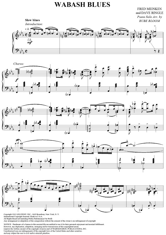 Digital Sheet Music for Wabash Blues by Dave Ringle, Fred Meinken, Rube Bloom scored for Piano Solo; id:355070