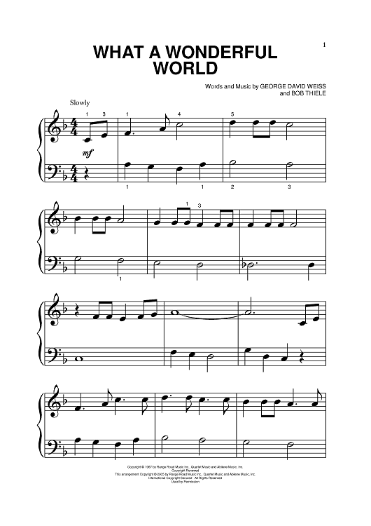 Digital Sheet Music for What A Wonderful World by Louis Armstrong, Bob Thiele, George David Weiss, Anne Murray, Eva Cassidy, Michael Buble, Kenny G scored for Piano; id:385181