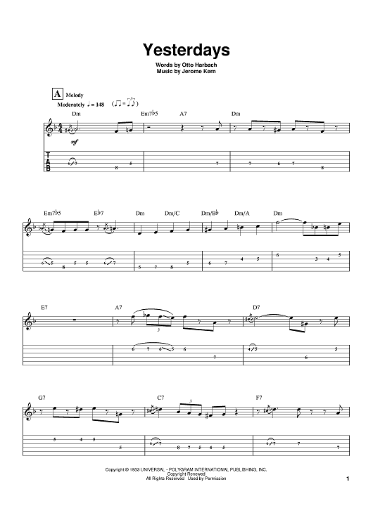Digital Sheet Music for Yesterdays by Jerome Kern, Otto Harbach, Wes Montgomery scored for Guitar Tab; id:395288