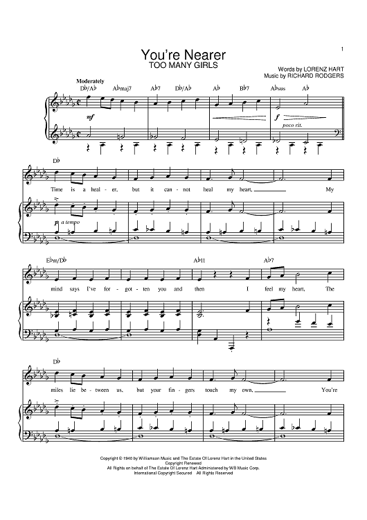 Digital Sheet Music for You're Nearer by Richard Rodgers, Lorenz Hart, Steve Lawrence, Shirley Horn scored for Piano/Vocal/Chords; id:369747