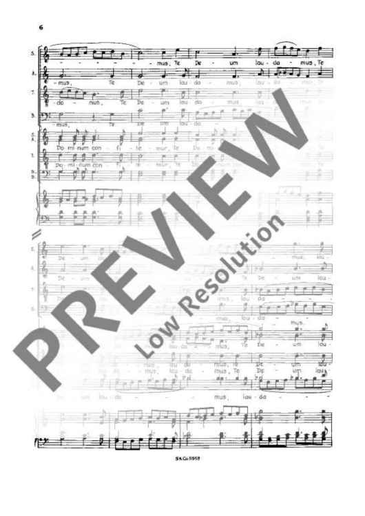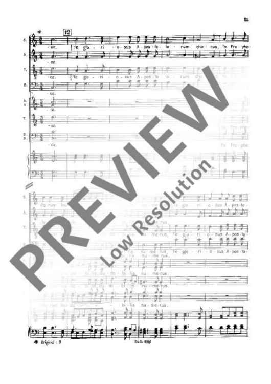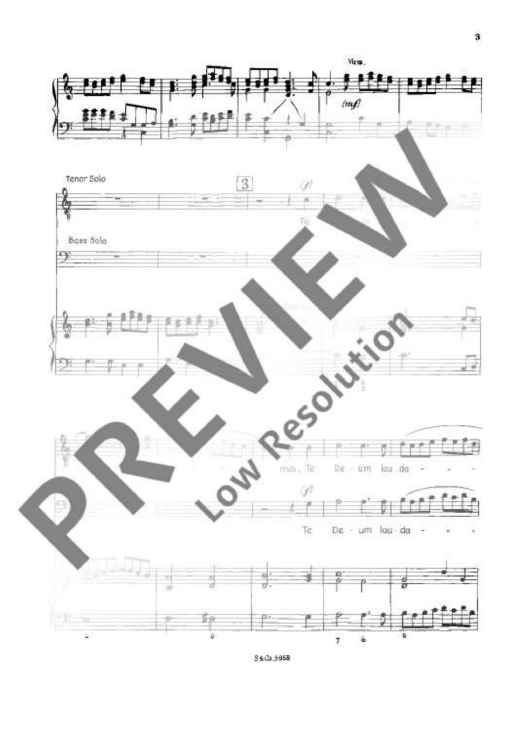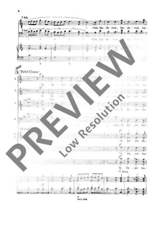 This edition of a "Te Deum" by J.-B. Lully (1632-1687), composed in 1677, has been compiled from part-books belonging to the Euing Library in the University of Glasgow, and we wish to record our gratitude to that University, and to its librarian, Mr. R.O. MacKenna, for placing them at our disposal. The original score consists of a Petit Choeur for semi-chorus and soli, a Grand Choeur for full chorus, and an orchestra consisting of two trumpets, strings and basso continuo. Although there is no timpani part in the Glasgow part-books, it seems evident that there is need for timpani in performance. The editor has therefore ventured to include a part for them. The soloists required are SSAATTB. Some of their parts could well be sung by members of the Petit Choeur. This edition presents the text of the original sources except for the piano part which is partly a realization of the figured bass (marked continuo) and partly an adaption of the instrumental score (marked piano score).