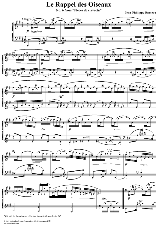 "Rappel des Oiseaux, Le - No. 6 from "Pieces de clavecin" 1724" Sheet Music by Jean-Philippe Rameau