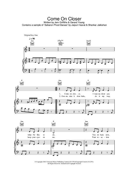 Digital Sheet Music for Come On Closer by Jem Griffiths, Jaipuri Hasrat, Shankar Jaikishan, Jem, Gerard Young scored for Piano/Vocal/Chords; id:383636