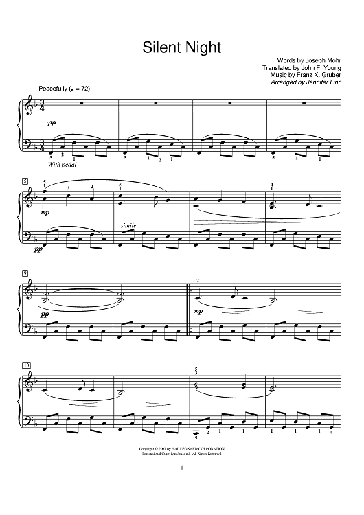 Digital Sheet Music for Silent Night by Franz Xaver Gruber, Josef Mohr, Jennifer Linn, John F. Young scored for Piano; id:401032