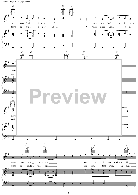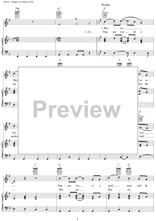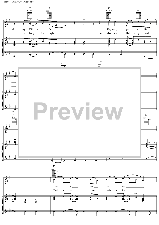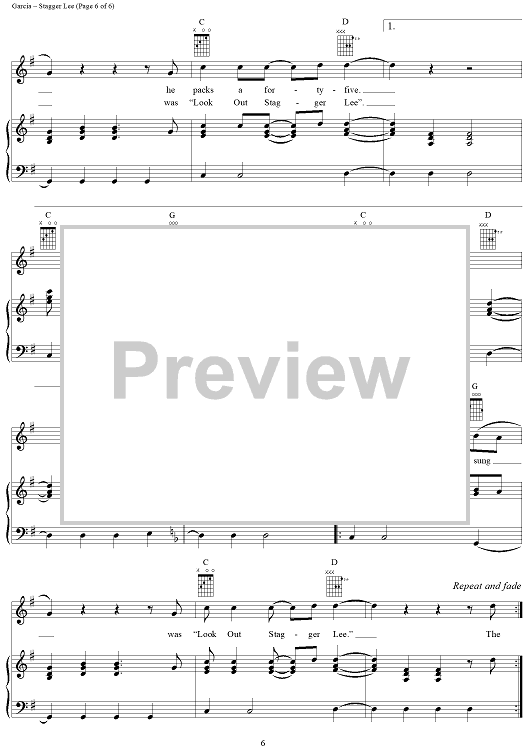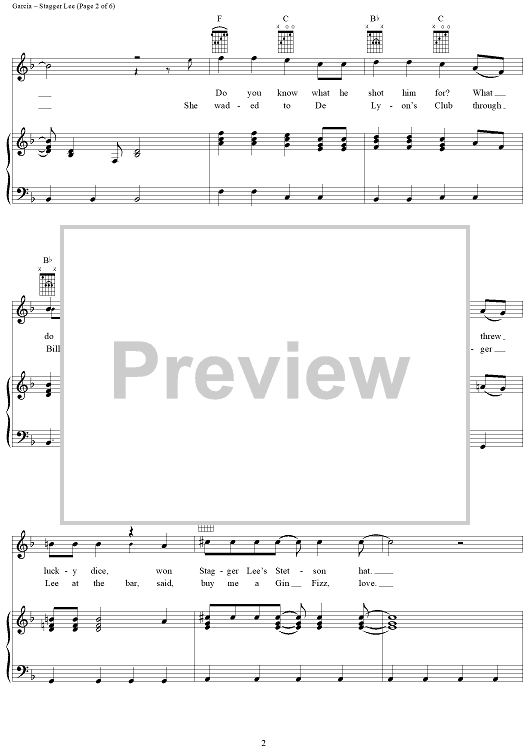 Digital Sheet Music for Stagger Lee by Jerry Garcia, Robert Hunter, Grateful Dead scored for Piano/Vocal/Chords; id:268991