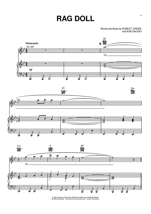 Digital Sheet Music for Rag Doll by Bob Crewe, Bob Gaudio, Frankie Valli, The Four Seasons scored for Piano/Vocal/Chords; id:389860