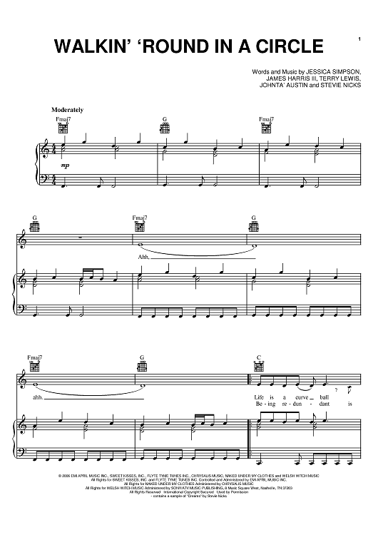 Digital Sheet Music for Walkin' 'Round In A Circle by Stevie Nicks, Jimmy Jam, Terry Lewis, Jessica Simpson, Johnta Austin scored for Piano/Vocal/Chords; id:397258