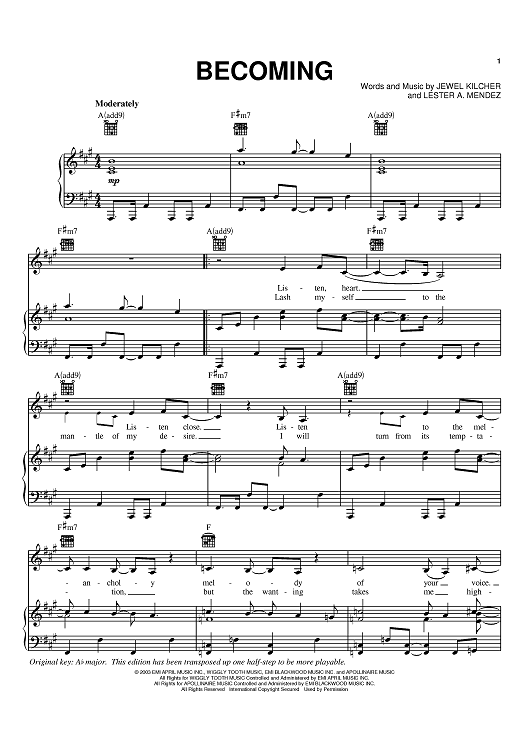 Digital Sheet Music for Becoming by Jewel, Lester Mendez scored for Piano/Vocal/Chords; id:372500