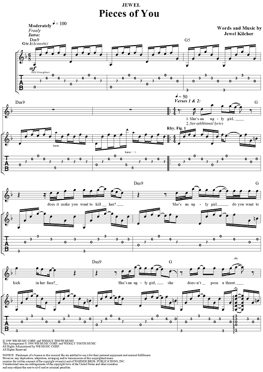 Digital Sheet Music for Pieces of You by Jewel scored for Guitar Tab/Vocal; id:111924