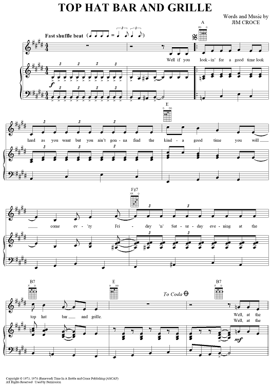 "Top Hat Bar And Grille" Sheet Music by Jim Croce