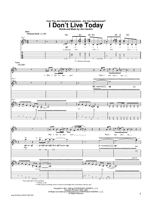 Digital Sheet Music for I Don't Live Today by Kenny Wayne Shepherd, Jimi Hendrix scored for Guitar Tab; id:372874