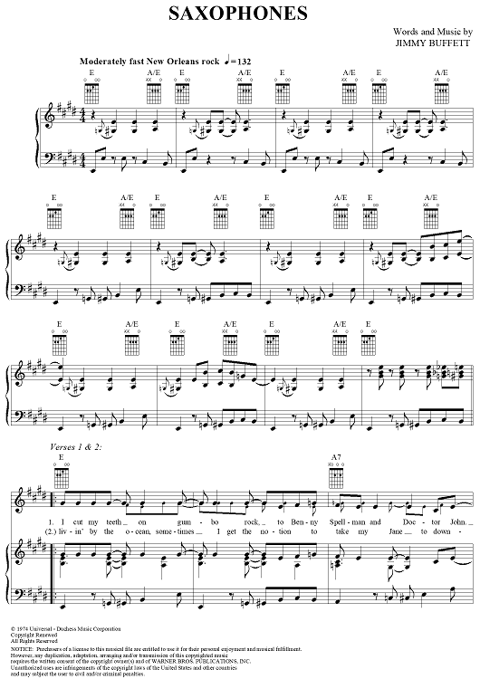 "Saxophones" Sheet Music by Jimmy Buffett