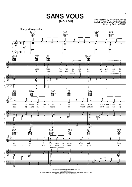 Digital Sheet Music for Sans Vous (No You) by Jimmy Kennedy, Andre Hornez, Paul Mizraki scored for Piano/Vocal/Chords; id:395241