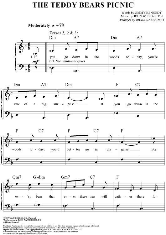 Digital Sheet Music for The Teddy Bears Picnic by Richard Bradley, Jimmy Kennedy, John W. Bratton scored for Easy Piano/Vocal; id:293022
