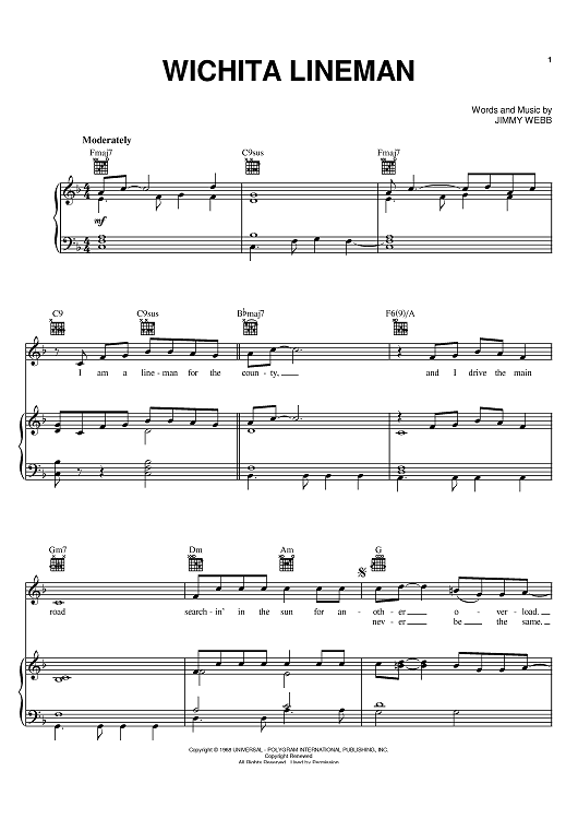 Digital Sheet Music for Wichita Lineman by Johnny Cash, Glen Campbell, Wade Hayes, Jimmy Webb scored for Piano/Vocal/Chords; id:380519
