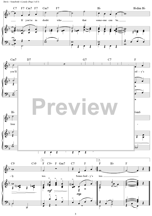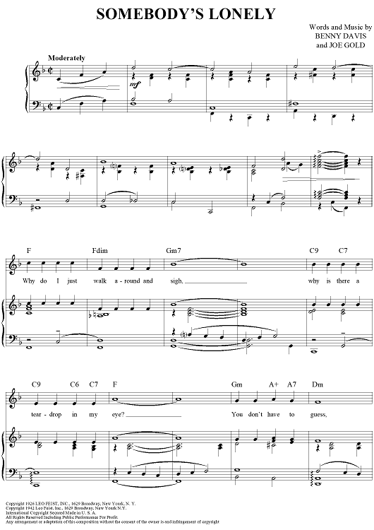 Digital Sheet Music for Somebody's Lonely by Benny Davis, Joe Gold scored for Piano/Vocal; id:427346