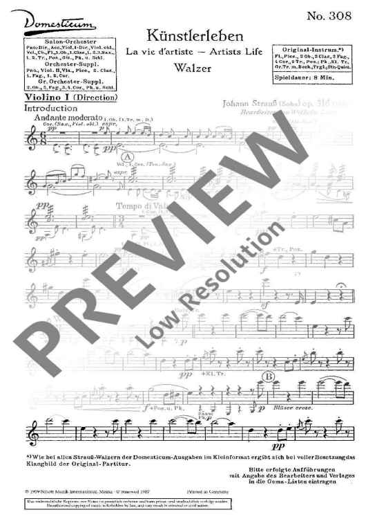 Digital Sheet Music for Künstlerleben - Violin I by Johann Strauß (Son) scored for Salon Orchestra; id:488218