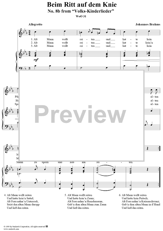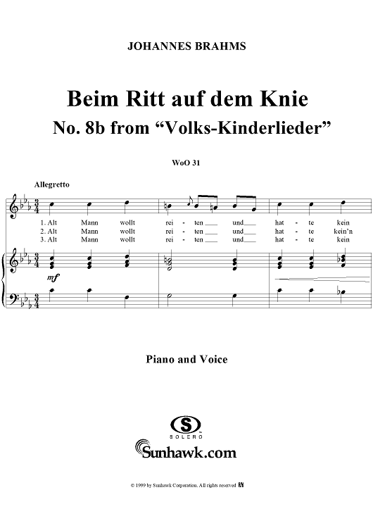 Digital Sheet Music for Beim Ritt auf dem Knie - No. 8b from "Volks-Kinderlieder" WoO 31 by Johannes Brahms scored for Voice/Piano; id:274293