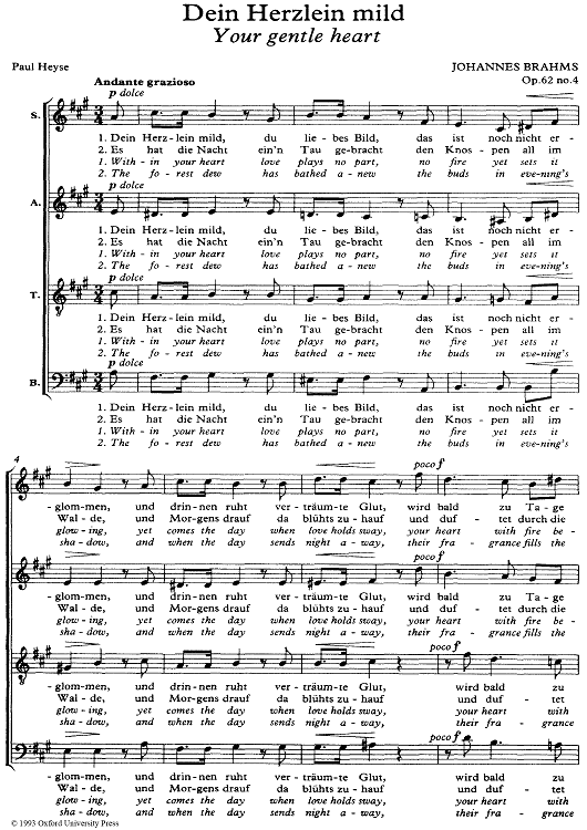 Digital Sheet Music for Dein Herzlein mild Op.62 No. 4 by Johannes Brahms scored for SATB Choir; id:336826