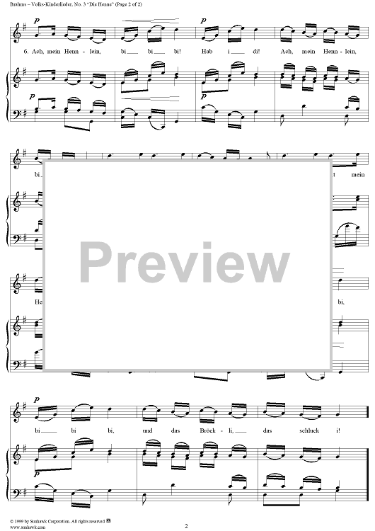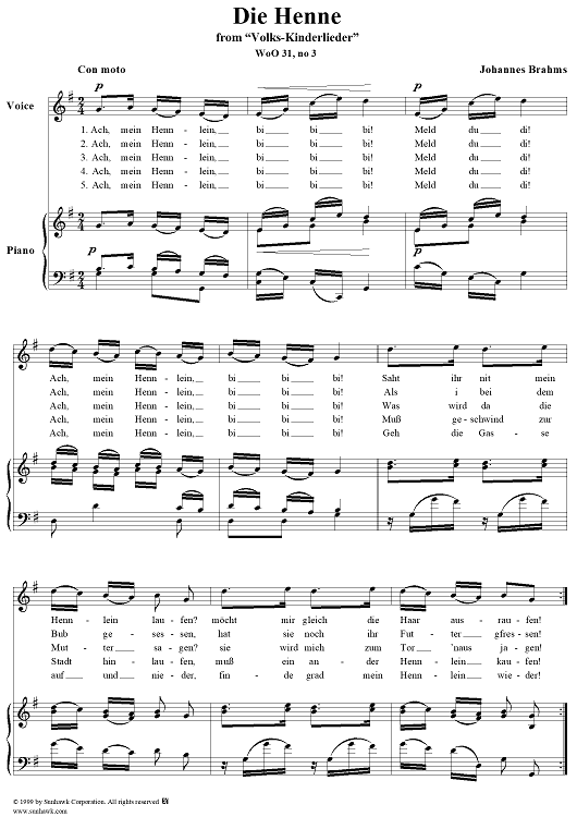 Digital Sheet Music for Die Henne - No. 3 from "Volks-Kinderlieder" WoO 31 by Johannes Brahms scored for Voice/Piano; id:274298