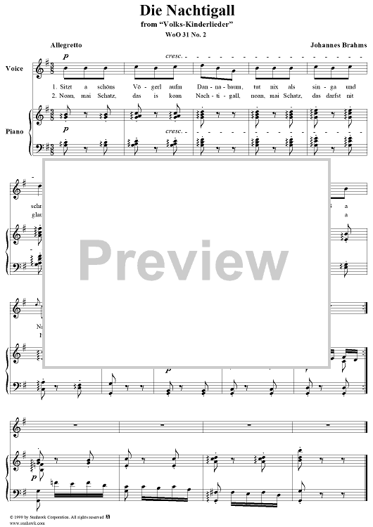 Digital Sheet Music for Die Nachtigall - No. 2 from "Volks-Kinderlieder" WoO 31 by Johannes Brahms scored for Voice/Piano; id:273765