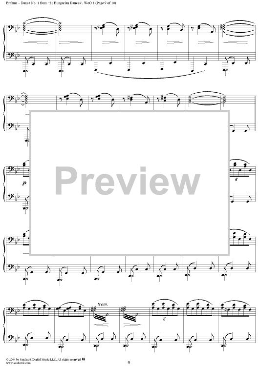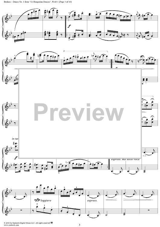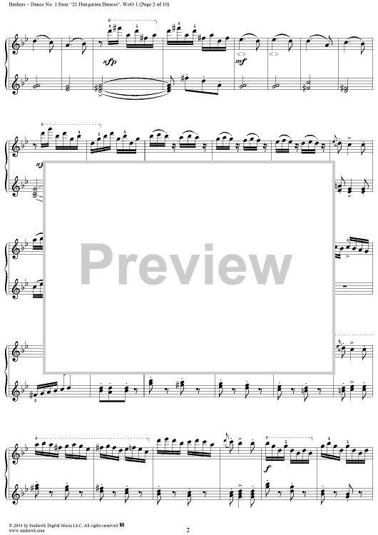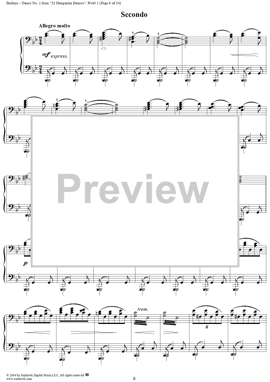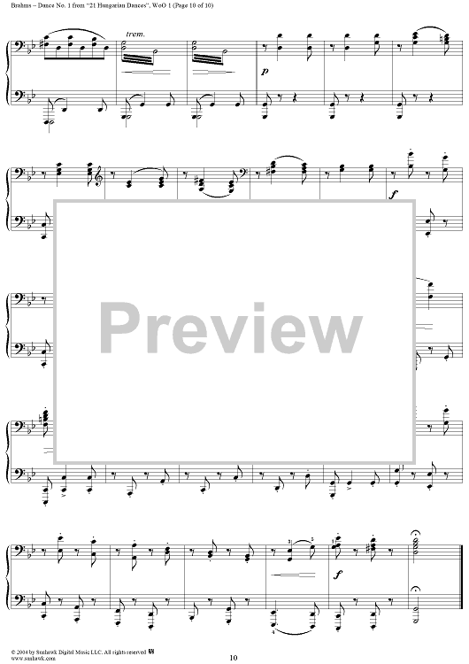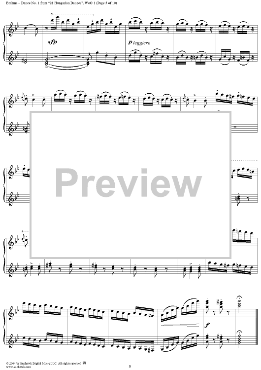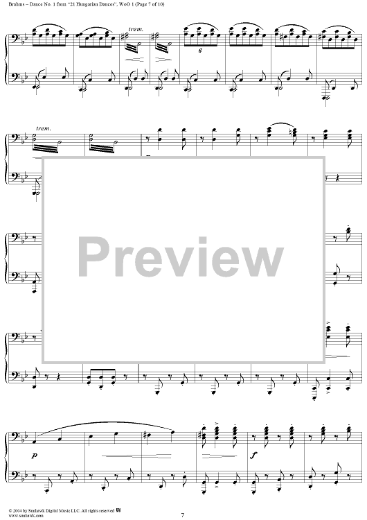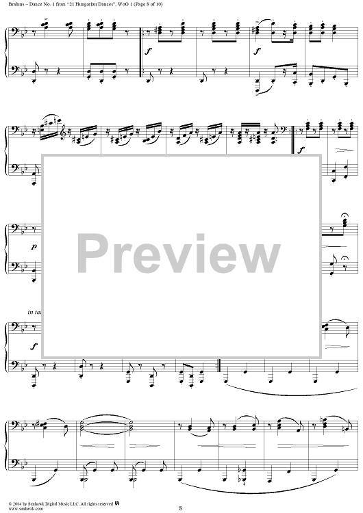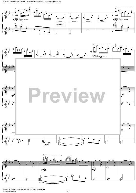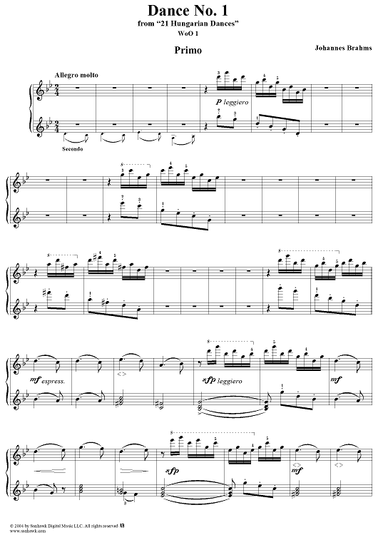 Digital Sheet Music for Hungarian Dance No. 1 by Johannes Brahms scored for 1 Piano, 4 Hands; id:296552
