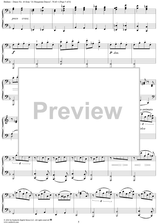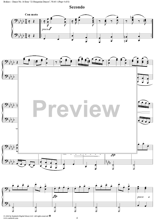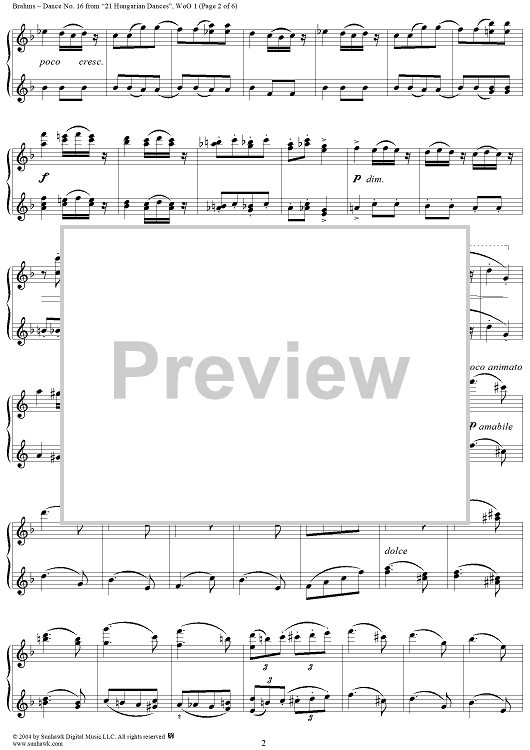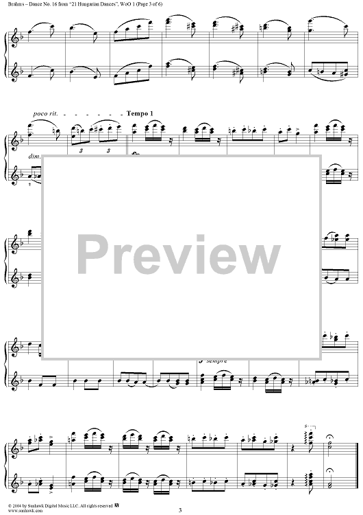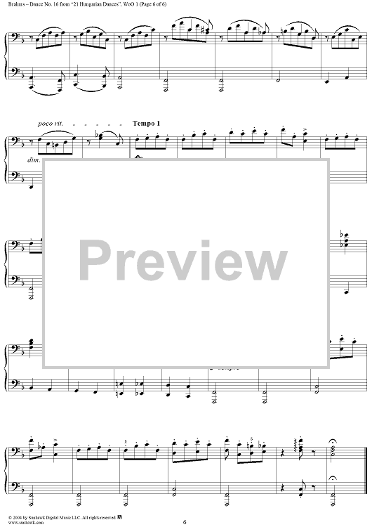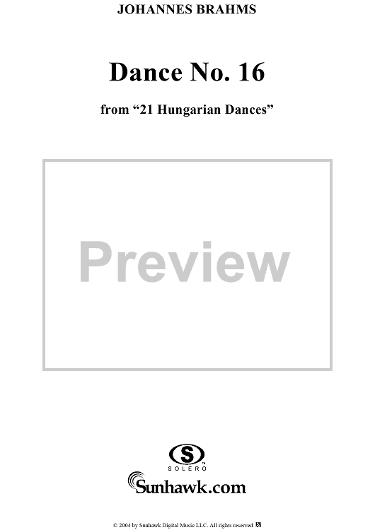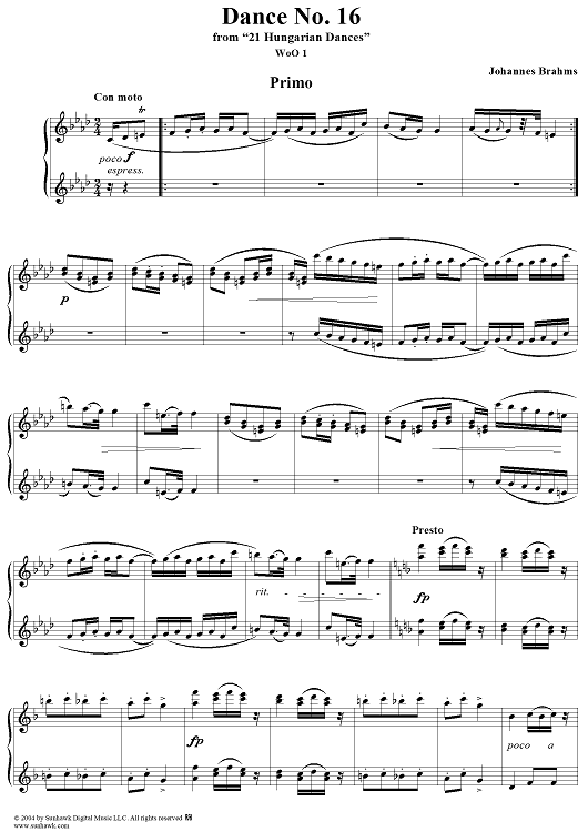 Digital Sheet Music for Hungarian Dance No. 16 by Johannes Brahms scored for 1 Piano, 4 Hands; id:296567