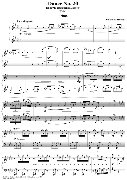 Digital Sheet Music for Hungarian Dance No. 20 by Johannes Brahms scored for 1 Piano, 4 Hands; id:296571