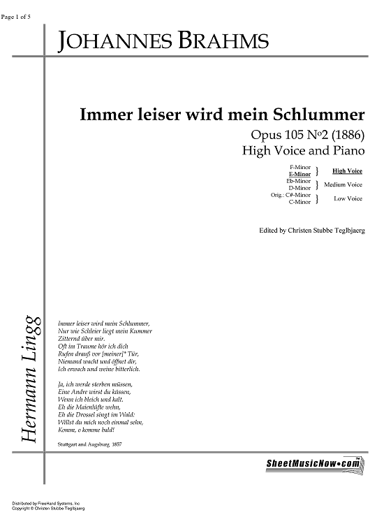 Digital Sheet Music for Immer leiser wird mein Schlummer Op.105 No. 2 by , Johannes Brahms scored for Soprano or Tenor/Piano; id:343272