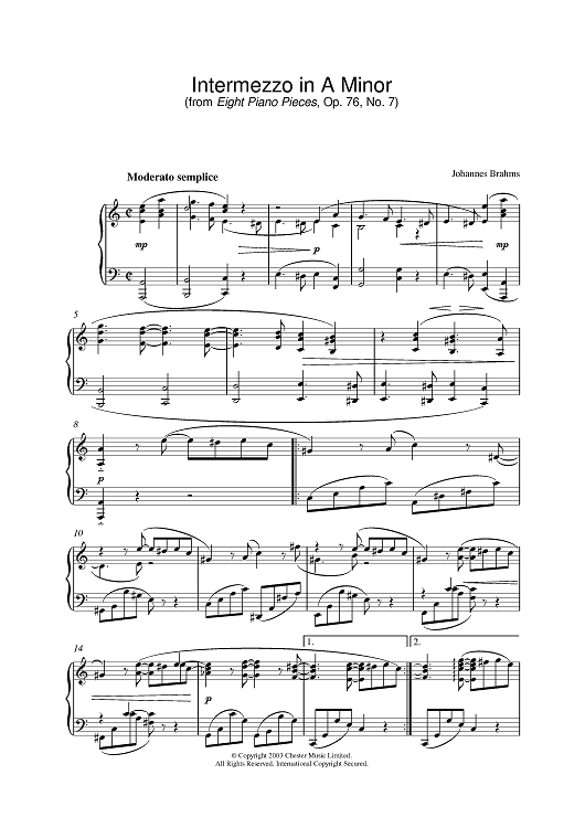 Digital Sheet Music for Intermezzo in A Minor (from Eight Piano Pieces, Op. 76, No. 7) by Johannes Brahms scored for Piano; id:377291