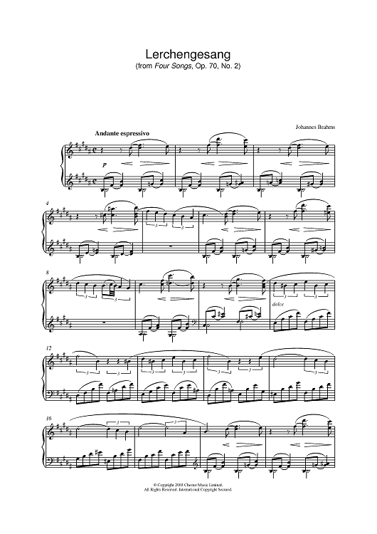 Digital Sheet Music for Lerchengesang (from Four Songs, Op. 70, No. 2) by Johannes Brahms scored for Piano; id:377270