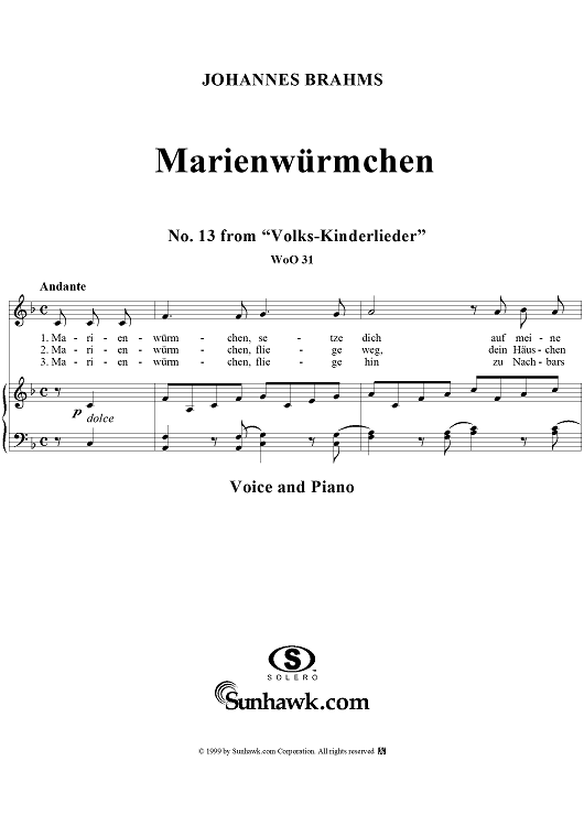 Digital Sheet Music for Marienwürmchen - No. 13 from "Volks-Kinderlieder" WoO 31 by Johannes Brahms scored for Voice/Piano; id:274320