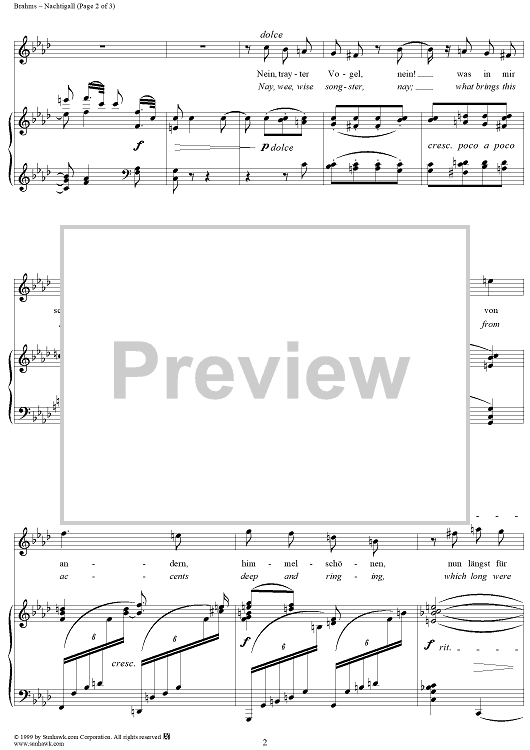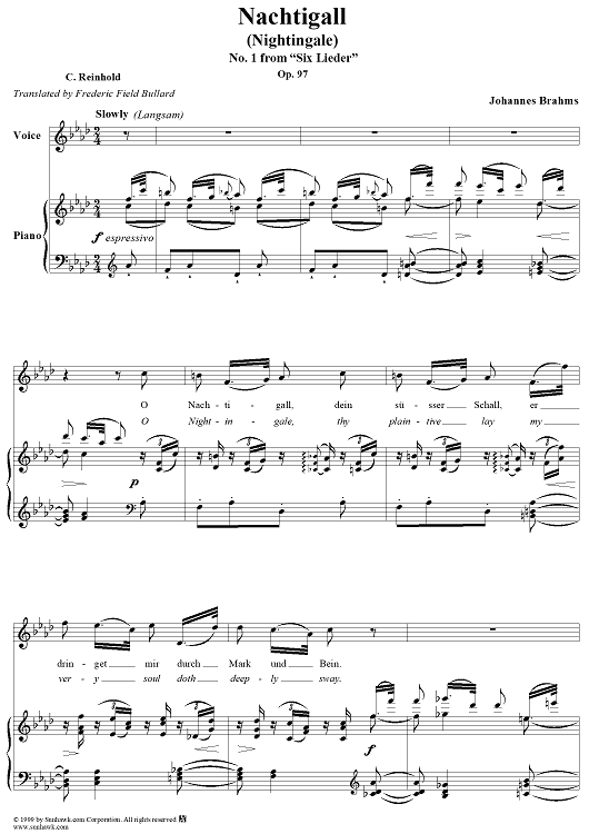 Digital Sheet Music for Nachtigall No. 1 from "Six Lieder" op. 97 by Johannes Brahms, C. Reinhold scored for Voice/Piano; id:274336