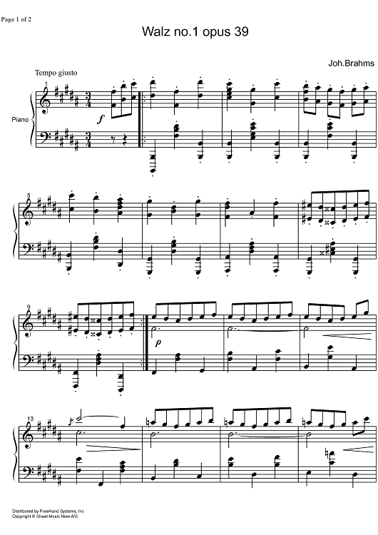 Digital Sheet Music for Waltz Op.39 No. 1 by Johannes Brahms scored for Piano Solo; id:325043
