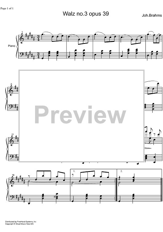 Digital Sheet Music for Waltz Op.39 No. 3 by Johannes Brahms scored for Piano Solo; id:325051