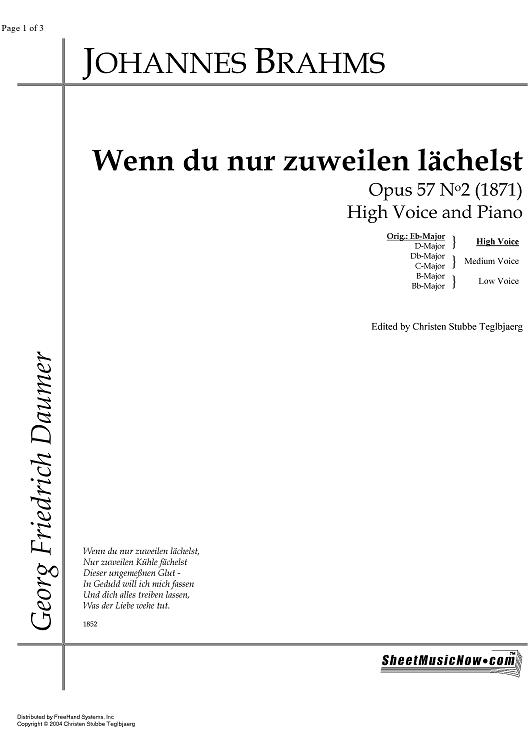 Digital Sheet Music for Wenn du nur zuweilen lächelst Op.57 No. 2 by , Johannes Brahms scored for Soprano or Tenor/Piano; id:343316