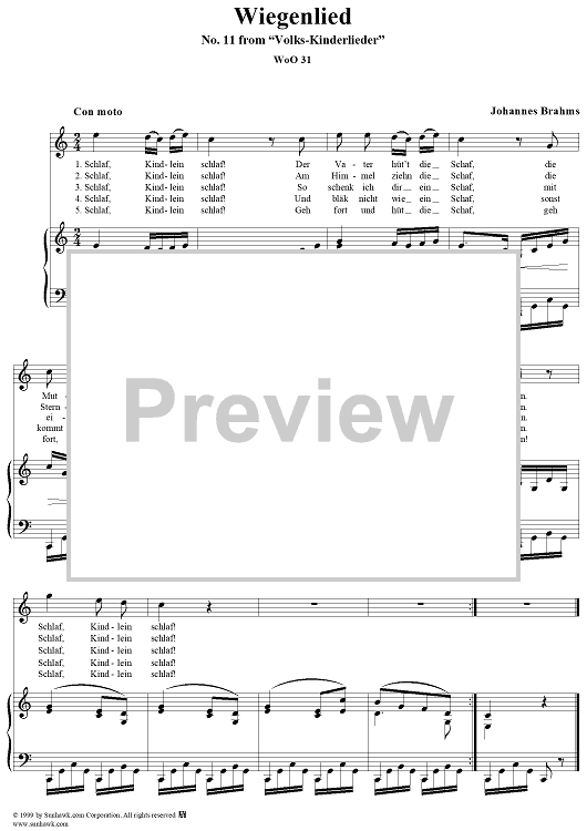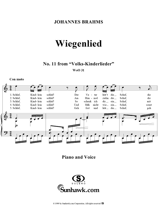 Digital Sheet Music for Wiegenlied - No. 11 from "Volks-Kinderlieder" WoO 31 by Johannes Brahms scored for Voice/Piano; id:274319