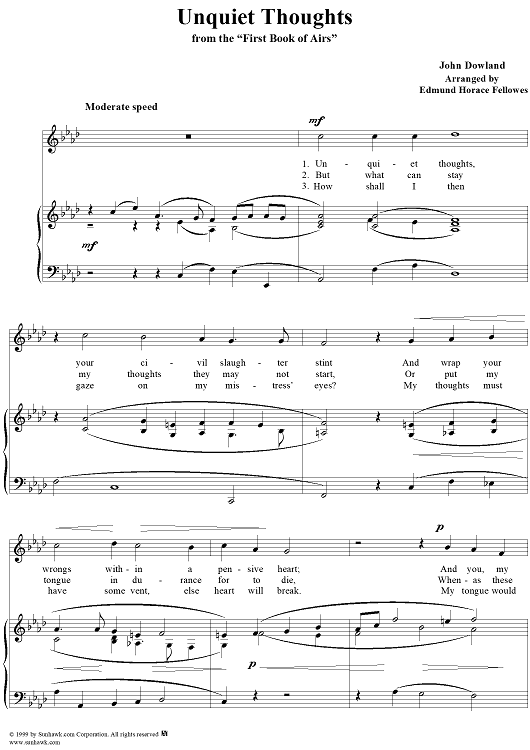 Digital Sheet Music for Unquiet Thoughts by John Dowland, Rev. Edmund Horace Fellowes scored for Voice/Piano; id:118363