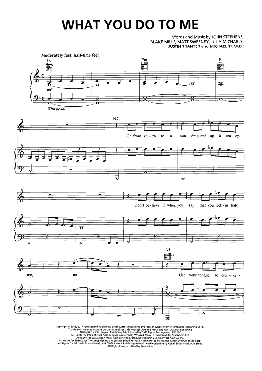 Digital Sheet Music for What You Do To Me by John Legend, Julia Michaels, Justin Tranter, Michael Tucker, Blake Mills, Matthew Sweeney scored for Piano/Vocal/Chords; id:464962
