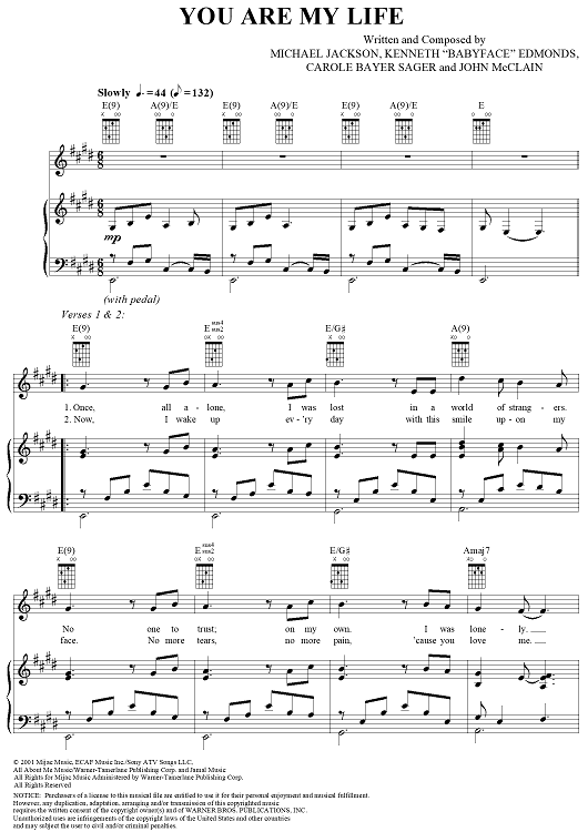 Digital Sheet Music for You Are My Life by Carole Bayer Sager, Michael Jackson, Babyface, John McClain scored for Piano/Vocal/Chords; id:288926