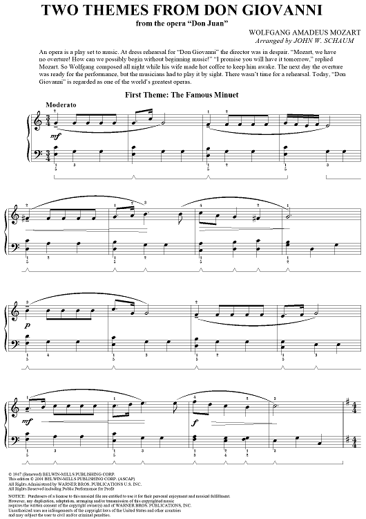 Digital Sheet Music for Two Themes from Don Giovanni (from the opera Don Juan) by Wolfgang Amadeus Mozart, John W. Schaum scored for Piano Solo; id:293146