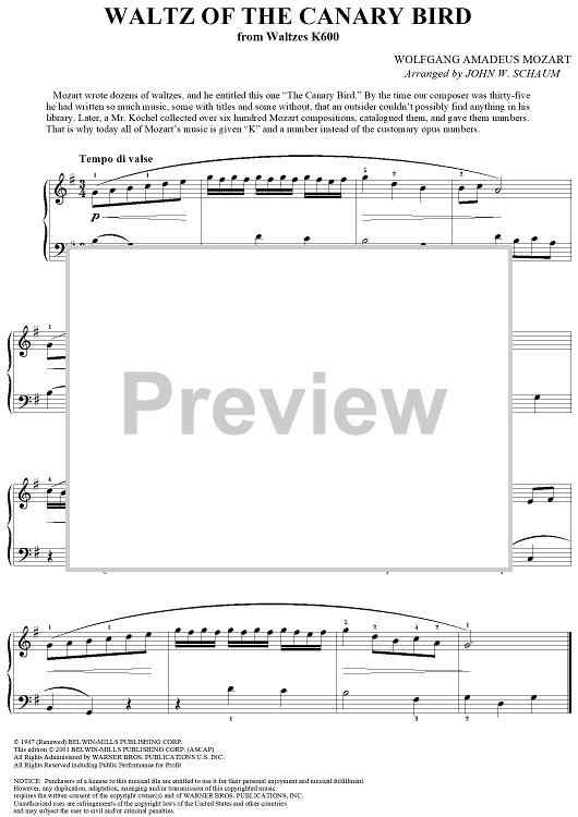 Digital Sheet Music for Waltz of the Canary Bird (from Waltzes K 600) by Wolfgang Amadeus Mozart, John W. Schaum scored for Piano Solo; id:293137