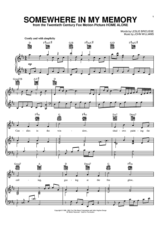 Digital Sheet Music for Somewhere In My Memory by Leslie Bricusse, John Williams, Bette Midler scored for Piano/Vocal/Chords; id:385021