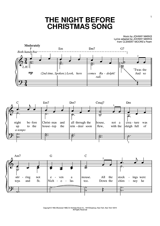 Digital Sheet Music for The Night Before Christmas Song by Gene Autry, Rosemary Clooney, Johnny Marks, Johnny Marks from Clement Moor scored for Easy Piano; id:375290