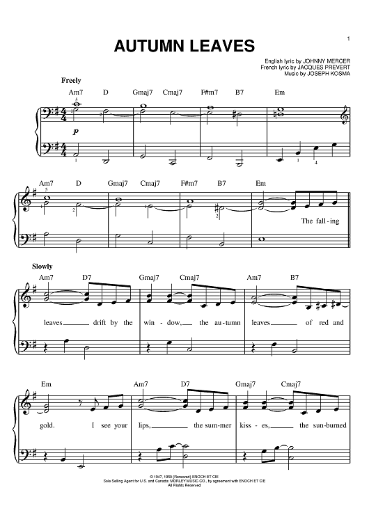 Digital Sheet Music for Autumn Leaves by Johnny Mercer, Ahmad Jamal, Bill Evans, Miles Davis, Jacques Prevert, Joseph Kosma, Cannonball Adderley, Kenny Werner scored for Easy Piano; id:385760